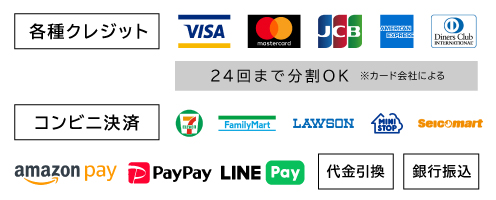 - お支払いはクレジットカード決済、銀行振り込み、代金引換、コンビニ決済、Amazonpay、LINEPay、PayPay決済がご利用いただけます。
